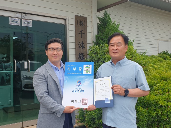 우리 본부에서는 (주)천수녹화조경 한천수 대표이사님께 평택시 기부증을 전달하였습니다.