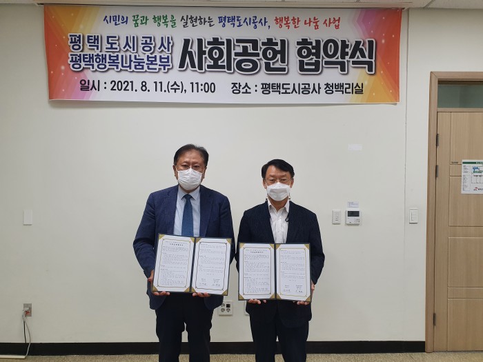 내용 : 평택행복나눔본부와 평택도시공사는 11일 지역사회공헌 협약을 체결하였다. 이번 협약으로 코로나19 등으로 어려움에 처한 관내 소외계층 지원, 관내 사회복지시설 공동 후원, 관내 취약계층 대상 각종 봉사활동 추진, 공동사업 수행을 위한 업무 협조 체계 구축 등을 위해 노력할 계획이다.