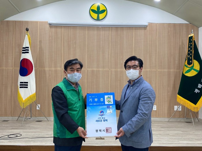 내용 : (사)평택시 새마을회(회장 최시영)에서는 2020년 코로나19 극복을 위한 성금 전달 및 저소득 가구를 위한 김치를 기탁해 이웃사랑을 실천하는 등, 지역사회 나눔 문화에 적극적으로 참여하여 감사의 마음을 담아 기부증을 전달하였다.
