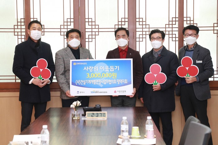 내용 : (사)건설기계개별연명사업자협의회 평택지회에서는 8일 평택시에 사랑의 이웃돕기 성금 300만원을 전달하였다. 성금은 지역사회 어려운 이웃을 위해 소중히 사용될 예정이다.