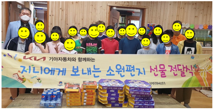 내용 : 기아자동차와 함께하는 '지니에게 보내는 소원편지' 사업을 통해 편지가 선정된 아동의 소원(친구들과 맛있는 간식을 먹고싶어요)에 따라 치킨과 피자 등을 전달하여 아이들이 함께 나누어 먹으며 즐거운 시간을 보낼 수 있었다.