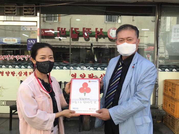내용 : 평택행복나눔본부에서는 서정리 역전식당(대표 박란)에 지난 5일 착한가게 현판을 전달하였다. 지역사회를 위한 나눔 활동에 동참할 수 있어서 기쁘고, 앞으로도 어려운 이웃에게 꾸준히 관심을 갖고 함께 하겠다고 밝혔다.