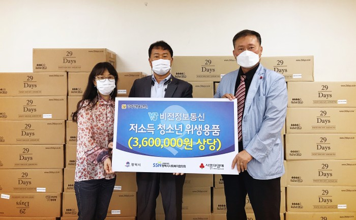내용 : 비전정보통신에서는 7일 평택행복나눔본부에 여성 위생용품(360만원 상당)을 전달하였다. 위생용품은 관내 읍면동 행정복지센터를 통해 저소득 가구 청소년을 위해 소중히 사용될 예정이다.