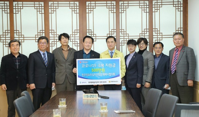 내용 : 민주평화통일자문회의 평택시협의회 회장 이봉희, (전)회장 이윤하, 수석부회장 오중근, 지회장 김성일, 최시영, 사무국장 김경한, 행정실장 김영옥은 코로나19 예방 및 극복을 위해 성금 500만원을 기탁하였다.