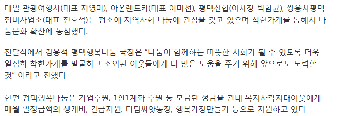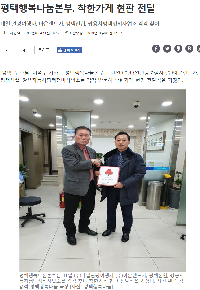 시민위해 나눔 실천하는 착한가게 현판 전달 페이지 정보 행복나눔 작성일19-04-16 17:02 조회1,899회 댓글0건 관련링크 http://www.newspim.com/news/view/20190131000839 2706회 연결 이전글 다음글 목록 본문 (주)대일관광여행사, (주)아온렌트카, 평택신협, (주)쌍용자동차평택정비사업소는 매월 일정액 정기후원으로 나눔을 실천하여 착한가게 현판 전달 댓글목록 등록된 댓글이 없습니다. 이전글 다음글 목록