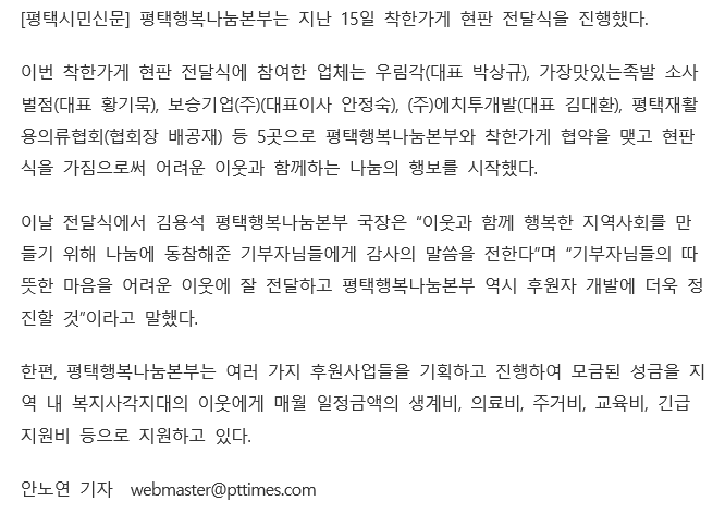 어려운 이웃과 함께하는 나눔의 행보. 착한가게 현판전달식 페이지 정보 행복나눔 작성일19-04-18 09:16 조회1,775회 댓글0건 관련링크 http://www.pttimes.com/news/articleView.html?idxno=50354 1149회 연결 http://www.m-i.kr/news/articleView.html?idxno=513791 1236회 연결 이전글 다음글 목록 본문 4/15일 착한가게 현판전달식 댓글목록 등록된 댓글이 없습니다. 이전글 다음글 목록