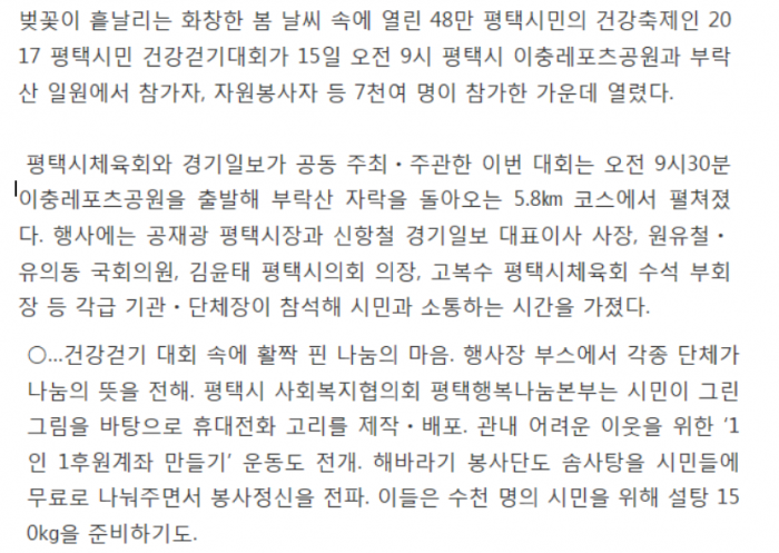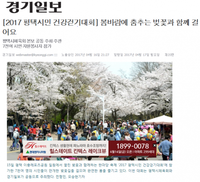 [2017평택시민건강걷기대회]봄바람에 춤추는 벗꽃과 함께 걸어요 페이지 정보 행복나눔 작성일17-06-07 11:17 조회3,467회 댓글0건 관련링크 http://www.kyeonggi.com/?mod=news&act=articleView&idxno=1340529 2335회 연결 이전글 다음글 목록 본문 댓글목록 등록된 댓글이 없습니다. 이전글 다음글 목록
