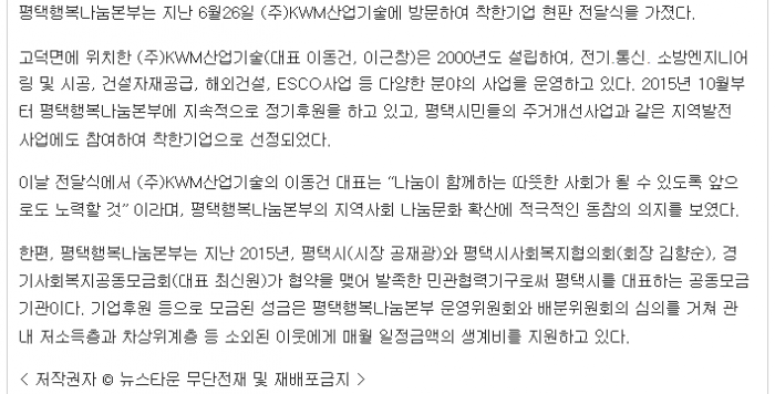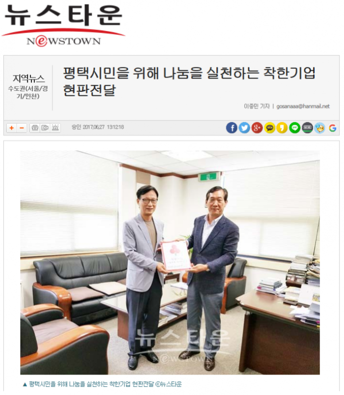 평택시민을 위해 나눔을 실천하는 착한기업 현판전달 페이지 정보 행복나눔 작성일17-07-05 09:34 조회3,282회 댓글0건 관련링크 http://www.newstown.co.kr/news/articleView.html?idxno=290363 1874회 연결 이전글 다음글 목록 본문 댓글목록 등록된 댓글이 없습니다. 이전글 다음글 목록