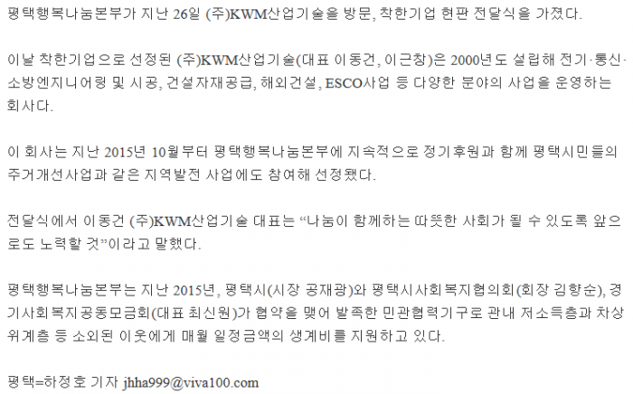 평택행복나눔본부, 착한기업 현판전달식 개최 페이지 정보 행복나눔 작성일17-07-05 09:55 조회3,026회 댓글0건 관련링크 http://www.viva100.com/main/view.php?key=20170627010009984 2304회 연결 이전글 다음글 목록 본문 댓글목록 등록된 댓글이 없습니다. 이전글 다음글 목록
