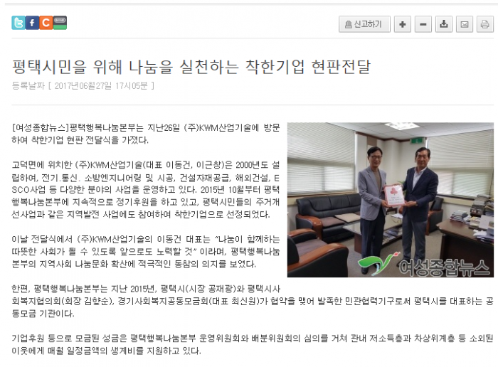 평택시민을 위해 나눔을 실천하는 착한기업 현판전달 페이지 정보 행복나눔 작성일17-07-05 10:00 조회2,970회 댓글0건 관련링크 http://womannews.net/detail.php?number=117881 1675회 연결 이전글 다음글 목록 본문 댓글목록 등록된 댓글이 없습니다. 이전글 다음글 목록