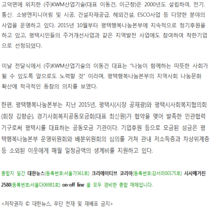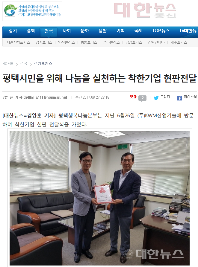 평택시민을 위해 나눔을 실천하는 착한기업 현판전달 페이지 정보 행복나눔 작성일17-07-05 10:32 조회2,789회 댓글0건 관련링크 http://www.dhns.co.kr/news/articleView.html?idxno=177821 1723회 연결 이전글 다음글 목록 본문 댓글목록 등록된 댓글이 없습니다. 이전글 다음글 목록