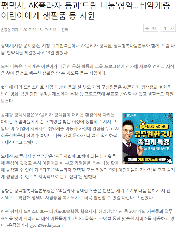 평택시, AK플라자 등과 '드림나눔'협약...취약계층 어린이에게 생필품 등 지원 페이지 정보 행복나눔 작성일17-06-05 16:42 조회3,237회 댓글0건 관련링크 http://www.sedaily.com/NewsView/1OEMQZE477 2715회 연결 이전글 다음글 목록 본문 댓글목록 등록된 댓글이 없습니다. 이전글 다음글 목록