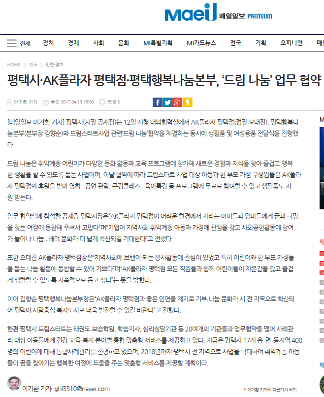 평택시, AK플라자평택점, 평택행복나눔본부 '드림나눔' 업무 협약 페이지 정보 행복나눔 작성일17-06-05 16:51 조회3,098회 댓글0건 관련링크 http://www.m-i.kr/news/articleView.html?idxno=303932 1724회 연결 이전글 다음글 목록 본문 댓글목록 등록된 댓글이 없습니다. 이전글 다음글 목록
