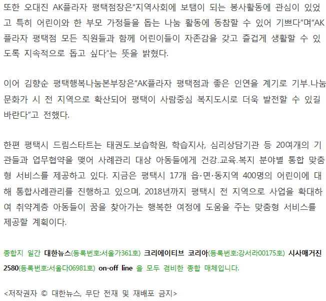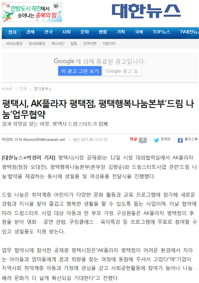 평택시, AK플라자평택점, 평택행복나눔본부 '드림나눔' 업무협약 페이지 정보 행복나눔 작성일17-06-07 08:44 조회3,044회 댓글0건 관련링크 http://www.dhns.co.kr/news/articleView.html?idxno=170141 2070회 연결 이전글 다음글 목록 본문 댓글목록 등록된 댓글이 없습니다. 이전글 다음글 목록