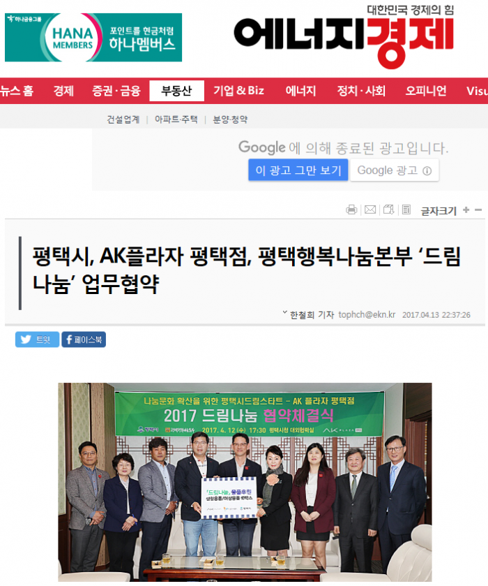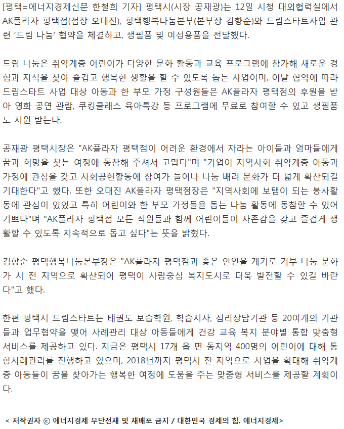 평택시, AK플라자평택점, 평택행복나눔본부 '드림나눔' 업무협약 페이지 정보 행복나눔 작성일17-06-07 09:12 조회3,065회 댓글0건 관련링크 http://www.ekn.kr/news/article.html?no=281188 2090회 연결 이전글 다음글 목록 본문 댓글목록 등록된 댓글이 없습니다. 이전글 다음글 목록
