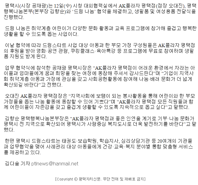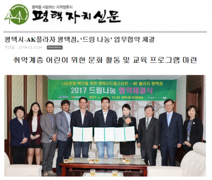 평택시-AK플라자 평택점, '드림 나눔' 업무협약 체결 페이지 정보 행복나눔 작성일17-04-18 17:51 조회3,776회 댓글0건 관련링크 http://www.ptlnews.kr/bbs/board.php?bo_table=news02&wr_id=103321 2156회 연결 이전글 다음글 목록 본문 댓글목록 등록된 댓글이 없습니다. 이전글 다음글 목록