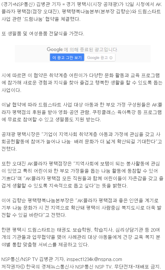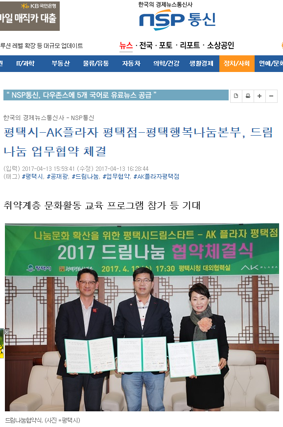 평택시-AK플라자평택점-평택행복나눔본부, 드림나눔 업무협약 체결 페이지 정보 행복나눔 작성일17-06-05 16:15 조회3,440회 댓글0건 관련링크 http://www.nspna.com/news/?mode=view&newsid=217599 2765회 연결 이전글 다음글 목록 본문 댓글목록 등록된 댓글이 없습니다. 이전글 다음글 목록