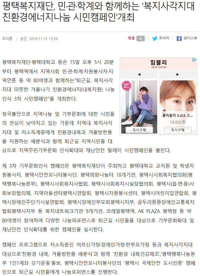 평택복지재단, 민관학계와 함께하는 복지사각지대 친환경에너지나눔 시민캠페인 개최 페이지 정보 행복나눔 작성일16-11-17 17:25 조회4,058회 댓글0건 관련링크 http://www.bokjinews.com/news/articleView.html?idxno=49793 2176회 연결 이전글 다음글 목록 본문 댓글목록 등록된 댓글이 없습니다. 이전글 다음글 목록