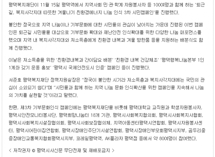 복지재단, 평택의 따뜻한 겨울나기 페이지 정보 행복나눔 작성일16-12-01 16:33 조회3,896회 댓글0건 관련링크 http://www.ptsisa.com/news/articleView.html?idxno=16399 1908회 연결 이전글 다음글 목록 본문 댓글목록 등록된 댓글이 없습니다. 이전글 다음글 목록