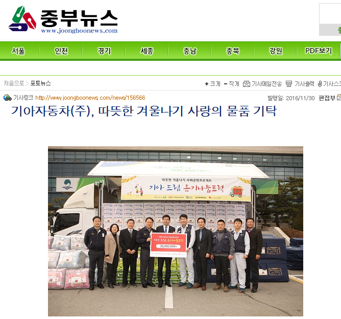 기아자동차(주), 따뜻한 겨울나기 사랑의 물품 기탁 페이지 정보 행복나눔 작성일16-12-06 17:53 조회3,649회 댓글0건 관련링크 http://www.joongboonews.com/news/156566 2112회 연결 이전글 다음글 목록 본문 댓글목록 등록된 댓글이 없습니다. 이전글 다음글 목록