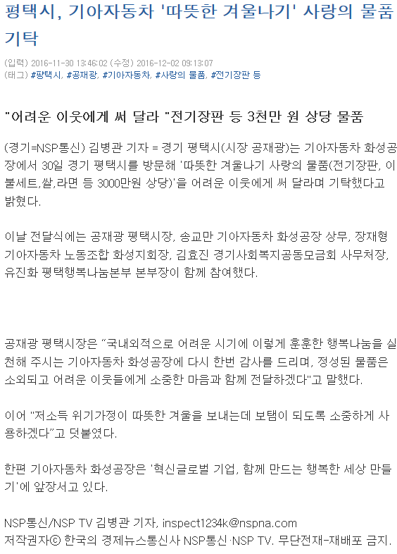 평택시, 기아자동차 '따뜻한 겨울나기' 사랑의 물품 기탁 페이지 정보 행복나눔 작성일16-12-07 09:47 조회3,795회 댓글0건 관련링크 http://www.nspna.com/news/?mode=view&newsid=197090 2774회 연결 이전글 다음글 목록 본문 댓글목록 등록된 댓글이 없습니다. 이전글 다음글 목록