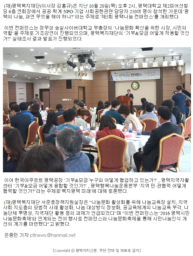 (재)평택복지재단 '제5회평택나눔컨퍼런스'성료 페이지 정보 행복나눔 작성일16-11-10 16:47 조회4,170회 댓글0건 관련링크 http://www.ptlnews.kr/bbs/board.php?bo_table=news03&wr_id=104402 2335회 연결 이전글 다음글 목록 본문 댓글목록 등록된 댓글이 없습니다. 이전글 다음글 목록