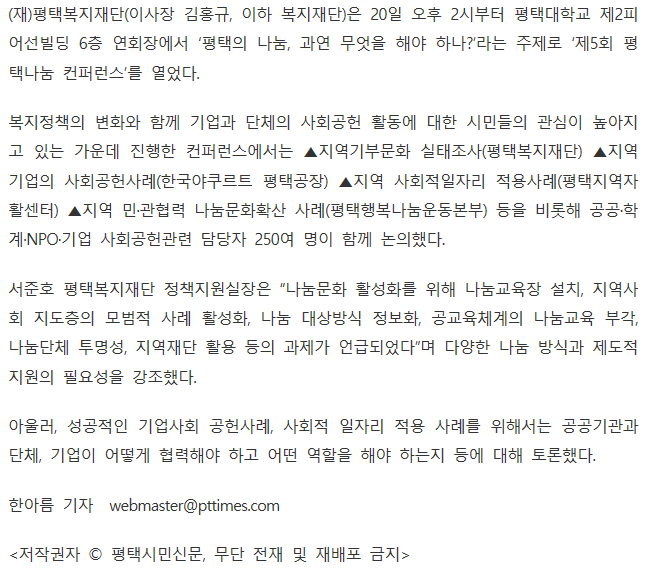 (재)평택복지재단, '제5회 평택나눔컨퍼런스' 페이지 정보 행복나눔 작성일16-11-10 16:51 조회3,916회 댓글0건 관련링크 http://www.pttimes.com/news/articleView.html?idxno=40172 2032회 연결 이전글 다음글 목록 본문 댓글목록 등록된 댓글이 없습니다. 이전글 다음글 목록
