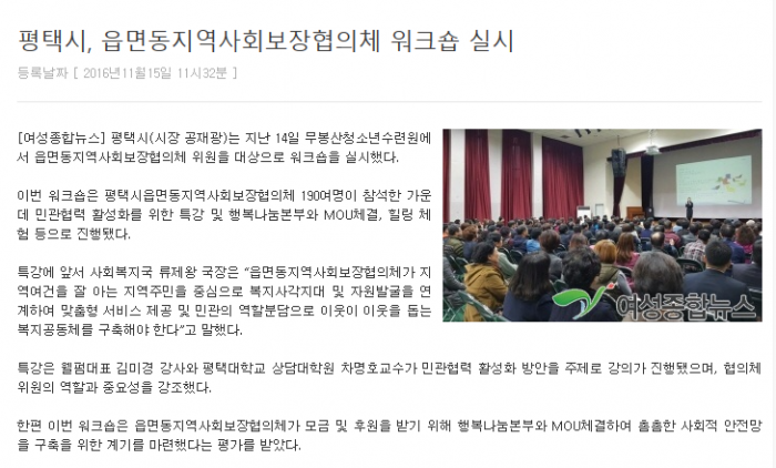 평택시, 읍면동지역사회보장협의체 워크숍 실시 페이지 정보 행복나눔 작성일16-11-15 14:19 조회3,883회 댓글0건 관련링크 http://womannews.net/detail.php?number=95404 1918회 연결 이전글 다음글 목록 본문 댓글목록 등록된 댓글이 없습니다. 이전글 다음글 목록