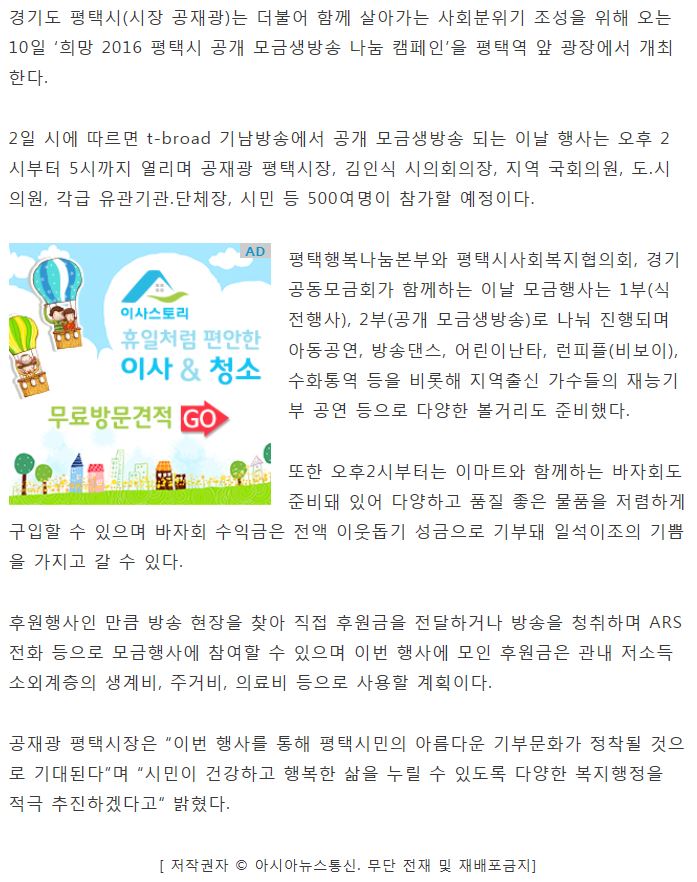 평택시, 공개 모금생방송 '나눔캠페인' 축제 연다 페이지 정보 행복나눔 작성일16-06-08 11:06 조회4,548회 댓글0건 관련링크 http://www.anewsa.com/detail.php?number=1023497 3341회 연결 이전글 다음글 목록 본문 댓글목록 등록된 댓글이 없습니다. 이전글 다음글 목록