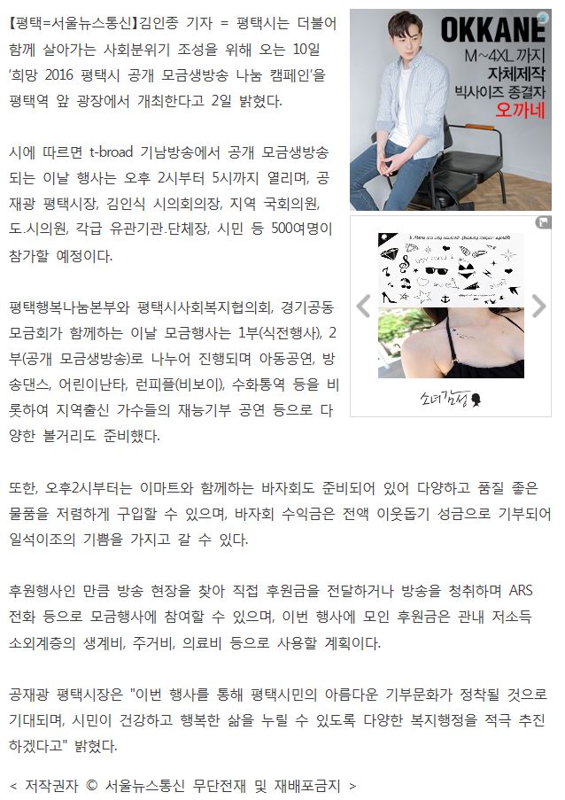 ‘희망 2016 평택시 공개 모금생방송 나눔캠페인’축제, 오는 10일 개최 페이지 정보 행복나눔 작성일16-06-08 10:55 조회4,731회 댓글0건 관련링크 http://www.snakorea.com/news/articleView.html?idxno=222252 2334회 연결 이전글 다음글 목록 본문 댓글목록 등록된 댓글이 없습니다. 이전글 다음글 목록