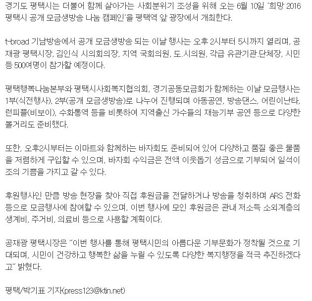 ‘희망 2016 평택시 공개 모금생방송 나눔캠페인’축제 개최 페이지 정보 행복나눔 작성일16-06-08 10:57 조회4,441회 댓글0건 관련링크 http://www.ktin.net/h/contentxxx.html?code=newsbd&idx=229533&hmidx=9 3258회 연결 이전글 다음글 목록 본문 댓글목록 등록된 댓글이 없습니다. 이전글 다음글 목록
