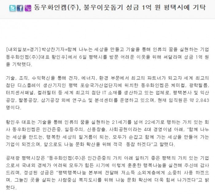 동우화인켐(주), 불우이웃돕기 성금 1억 원 평택시에 기탁 페이지 정보 행복나눔 작성일16-04-07 17:24 조회4,441회 댓글0건 관련링크 http://naewoeilbo.com/detail.php?number=131263 1835회 연결 이전글 다음글 목록 본문 댓글목록 등록된 댓글이 없습니다. 이전글 다음글 목록