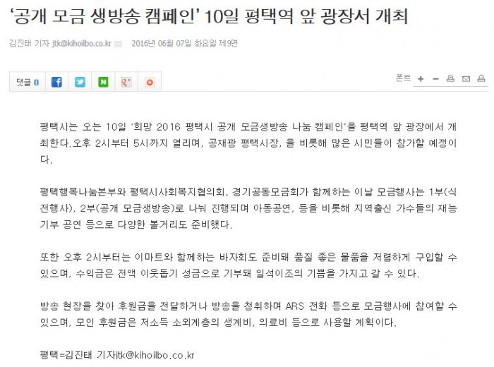‘공개 모금 생방송 캠페인’ 10일 평택역 앞 광장서 개최 페이지 정보 행복나눔 작성일16-06-08 10:32 조회4,151회 댓글0건 관련링크 http://www.kihoilbo.co.kr/?mod=news&act=articleView&idxno=653688 1956회 연결 이전글 다음글 목록 본문 댓글목록 등록된 댓글이 없습니다. 이전글 다음글 목록