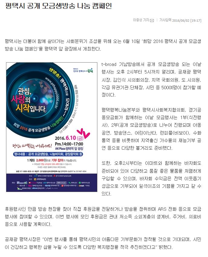 평택시 공개 모금생방송 나눔 캠페인 페이지 정보 행복나눔 작성일16-06-08 10:33 조회4,314회 댓글0건 관련링크 http://www.why25.com/sub_read.html?uid=58427 2595회 연결 이전글 다음글 목록 본문 댓글목록 등록된 댓글이 없습니다. 이전글 다음글 목록