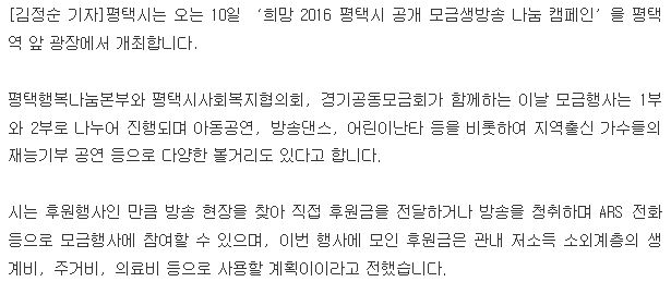 평택시, 희망 2016 공개 모금생방송 나눔캠페인축제 페이지 정보 행복나눔 작성일16-06-08 10:34 조회4,402회 댓글0건 관련링크 http://www.theonetv.kr/sub_read.html?uid=57708 2005회 연결 이전글 다음글 목록 본문 댓글목록 등록된 댓글이 없습니다. 이전글 다음글 목록