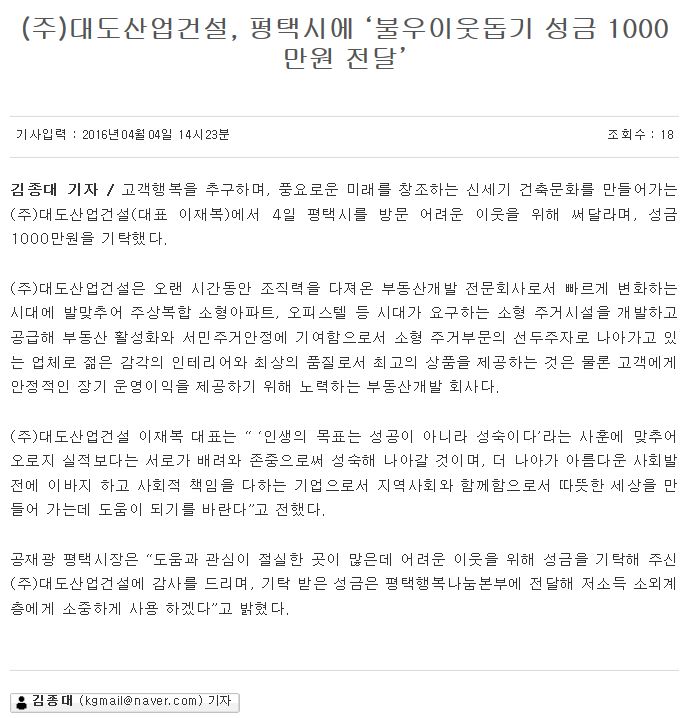 (주)대도산업건설, 평택시에 ‘불우이웃돕기 성금 1000만원 전달’ 페이지 정보 행복나눔 작성일16-04-07 11:00 조회4,190회 댓글0건 관련링크 http://kgmaeil.net/detail.php?number=88700 1993회 연결 이전글 다음글 목록 본문 댓글목록 등록된 댓글이 없습니다. 이전글 다음글 목록
