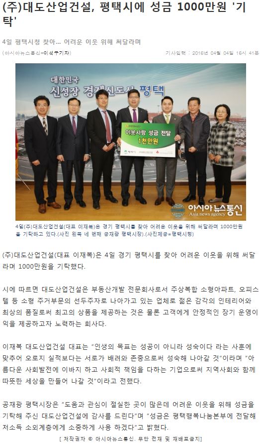 (주)대도산업건설, 평택시에 성금 1000만원 '기탁' 페이지 정보 행복나눔 작성일16-04-07 11:28 조회4,353회 댓글0건 관련링크 http://www.anewsa.com/detail.php?number=996981 3453회 연결 이전글 다음글 목록 본문 댓글목록 등록된 댓글이 없습니다. 이전글 다음글 목록