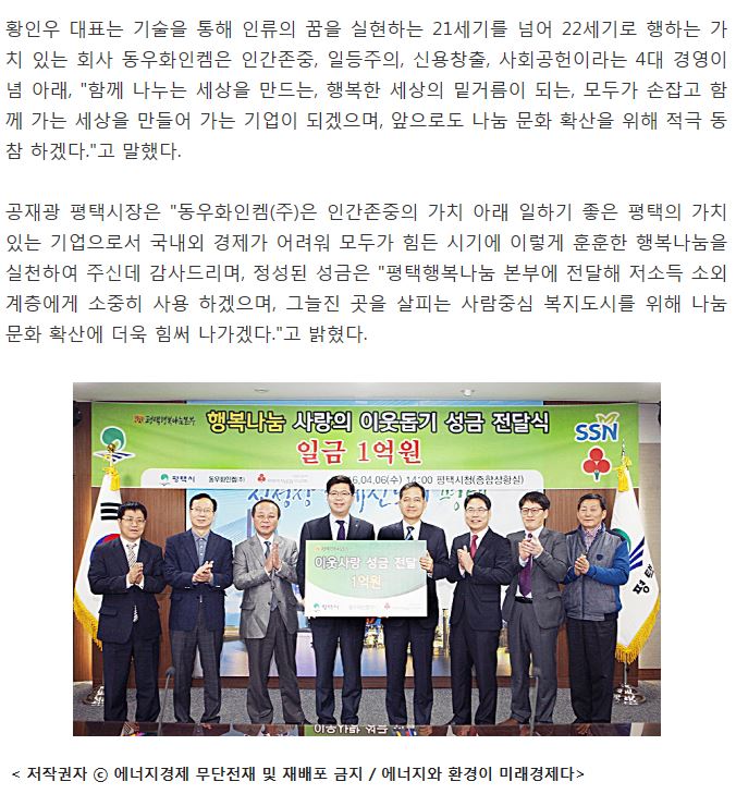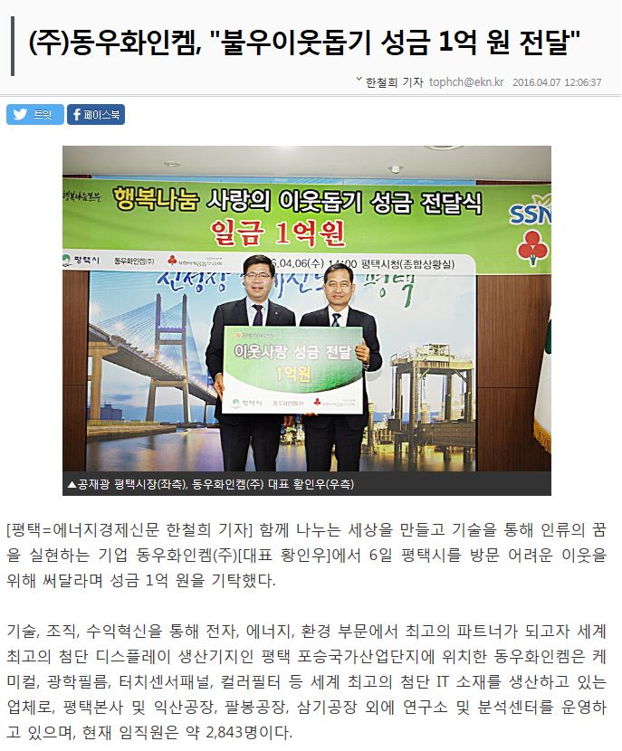 (주)동우화인캠 불우이웃돕기 성금 1억원 전달 페이지 정보 행복나눔 작성일16-04-07 17:15 조회4,349회 댓글0건 관련링크 http://www.ekn.kr/news/article.html?no=211698 2867회 연결 이전글 다음글 목록 본문 댓글목록 등록된 댓글이 없습니다. 이전글 다음글 목록