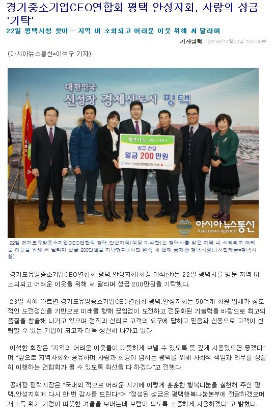경기중소기업CEO연합회 평택안성지회, 사랑의 성금 '기탁' 페이지 정보 행복나눔 작성일16-02-24 17:27 조회4,753회 댓글0건 이전글 다음글 목록 본문 댓글목록 등록된 댓글이 없습니다. 이전글 다음글 목록