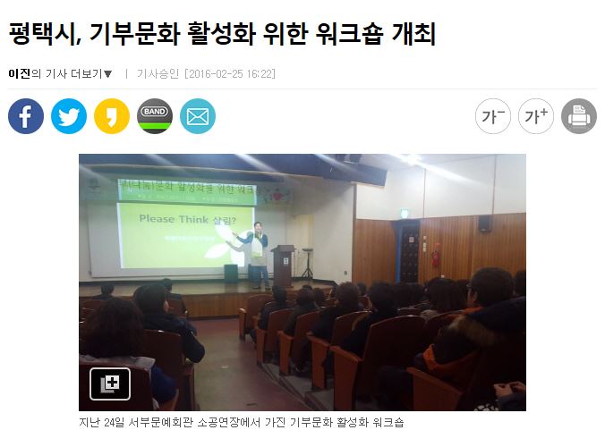 평택시, 기부문화 활성화 위한 워크숍 개최 페이지 정보 행복나눔 작성일16-04-07 10:08 조회4,303회 댓글0건 관련링크 http://www.asiatoday.co.kr/view.php?key=20160225010016397 2910회 연결 이전글 다음글 목록 본문 댓글목록 등록된 댓글이 없습니다. 이전글 다음글 목록