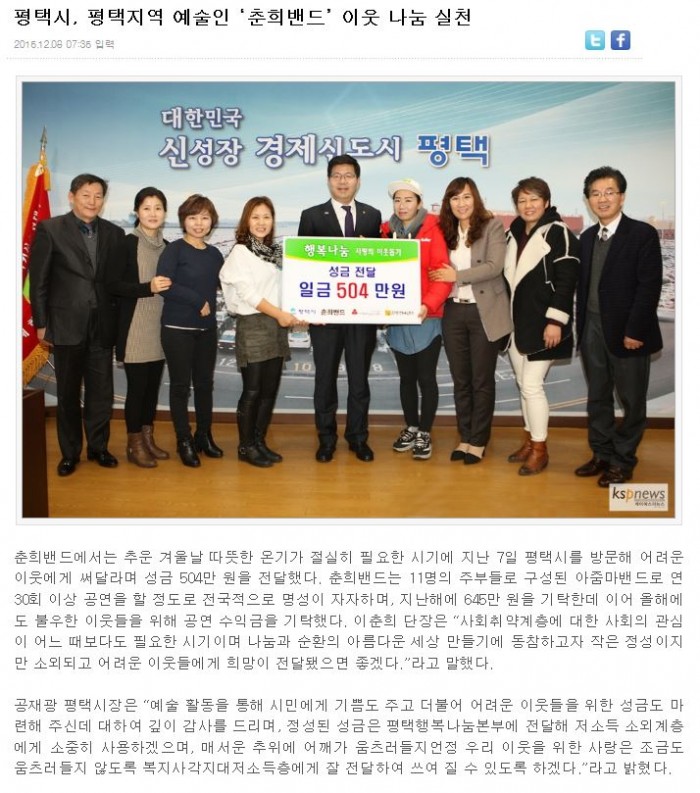 평택시, 평택지역 예술인 '춘희밴드' 이웃 나눔 실천 페이지 정보 행복나눔 작성일15-12-22 15:50 조회4,714회 댓글0건 이전글 다음글 목록 본문 댓글목록 등록된 댓글이 없습니다. 이전글 다음글 목록