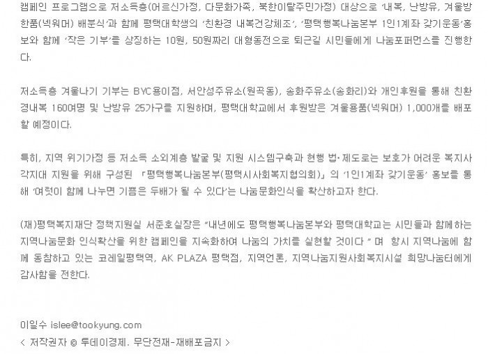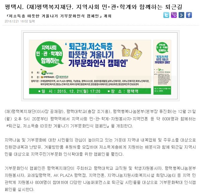 평택시, (재)평택복지재단, 지역사회 민·관 ·학계와 함께하는 퇴근길 페이지 정보 행복나눔 작성일15-12-22 16:04 조회4,589회 댓글0건 이전글 다음글 목록 본문 댓글목록 등록된 댓글이 없습니다. 이전글 다음글 목록