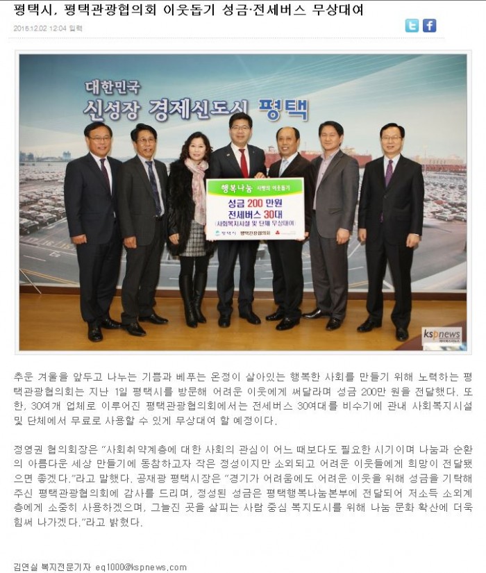 평택시, 평택관광협의회 이웃돕기 성금·전세버스 무상대여 페이지 정보 행복나눔 작성일15-12-22 15:10 조회4,583회 댓글0건 이전글 다음글 목록 본문 댓글목록 등록된 댓글이 없습니다. 이전글 다음글 목록
