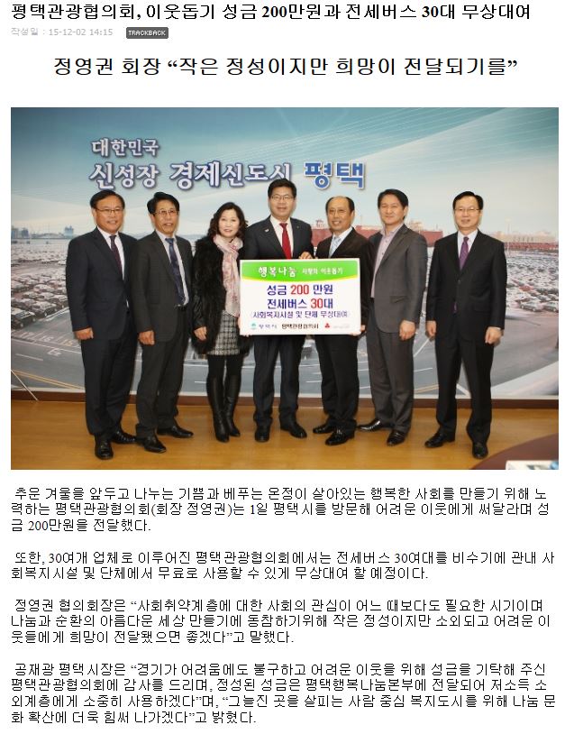 평택관광협의회, 이웃돕기 성금 200만원과 전세버스 30대 무상대여 페이지 정보 행복나눔 작성일15-12-22 15:11 조회4,639회 댓글0건 이전글 다음글 목록 본문 댓글목록 등록된 댓글이 없습니다. 이전글 다음글 목록