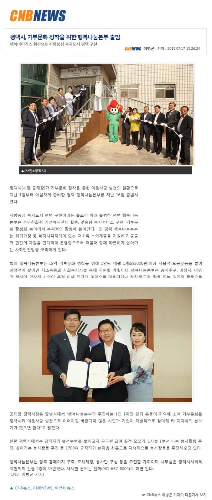평택시, 기부문화 정착을 위한 행복나눔본부 출범 페이지 정보 행복나눔 작성일15-08-27 18:17 조회4,867회 댓글0건 이전글 다음글 목록 본문 댓글목록 등록된 댓글이 없습니다. 이전글 다음글 목록