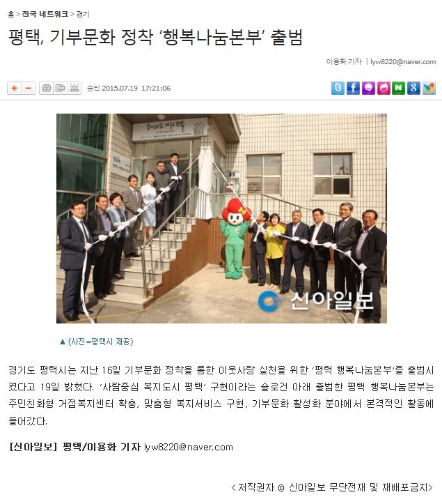 평택, 기부문화 정착'행복나눔본부'출범 페이지 정보 행복나눔 작성일15-08-27 18:18 조회5,048회 댓글0건 이전글 다음글 목록 본문 댓글목록 등록된 댓글이 없습니다. 이전글 다음글 목록