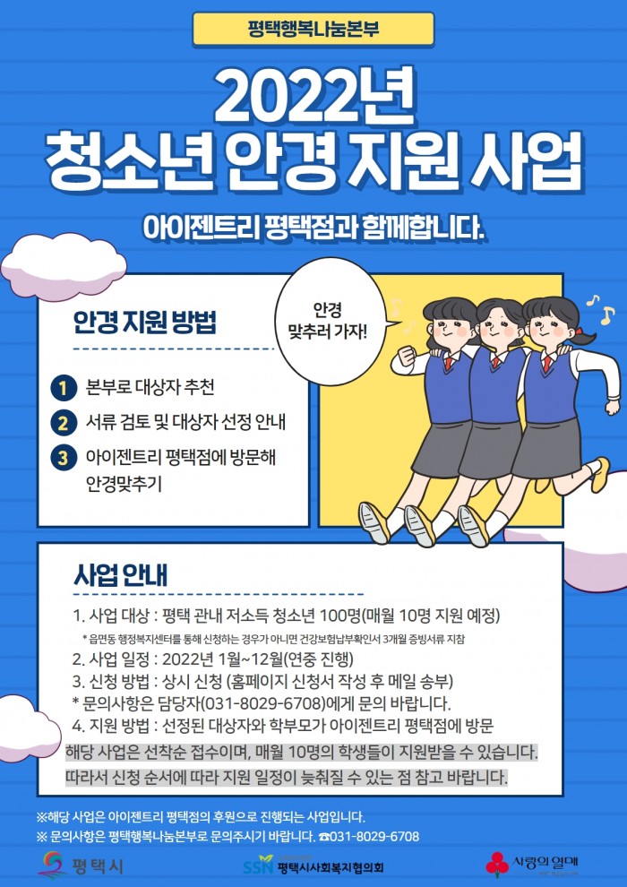 2. 평택행복나눔본부는 아이젠트리 평택점과 연계하여, 시력 교정이 필요한 저소득 가구 청소년에게 안경을 후원하는 사업을 진행하오니 붙임자료를 참고하시어 적극적인 홍보와 신청을 바랍니다.